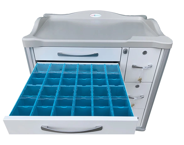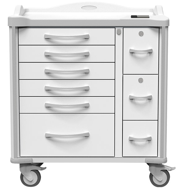 With enhanced, secure, pharmaceutical and supply storage management our medical cart offers maximum capacity, organization and flexibility and the NARCOTIC DRAWERS are designed where they should be… at waist height!